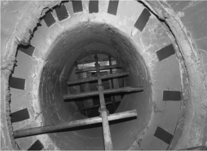(3)原耐火材料由環(huán)形托架支撐,環(huán)形托架熱膨脹時受內(nèi)筒拘束向下變形,耐火材料得不到有效支撐,終脫落。