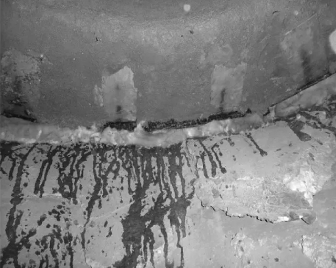 3、耐磨可塑料施工??伤芰戏笤O(shè)在施工構(gòu)件上后,用木錘或橡皮錘搗打密實。塊與塊之間的接縫也應(yīng)搗打密實,使接縫嚴(yán)密,將表面壓光、壓平。所施工部位與原來墻體接縫處應(yīng)確保平滑過渡,不得凹進(jìn)或凸出。用磷酸鋁溶液浸泡硅酸鋁纖維板封堵膨脹縫,避免鍋爐運行過程中出現(xiàn)竄風(fēng)現(xiàn)象,導(dǎo)致非金屬補償器燒損。耐磨可塑料施工完畢后的膨脹縫封堵如圖4所示。